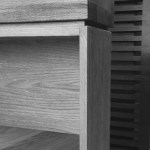 Both pieces are made from fumed red oak and blue de savoie marble, the materials separated out by brass accents.